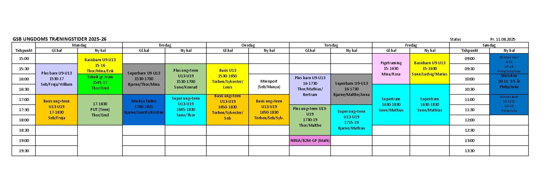 Træningstider: Mandag kl. 15.00 - 16.00 i Ny hal (Hal 2), onsdag kl. 15.30 - 16.50 kun for U13 i Gammel Hal (Hal 1), fredag kl. 15.00 - 16.30 i Gl. Hal (Hal 1).
